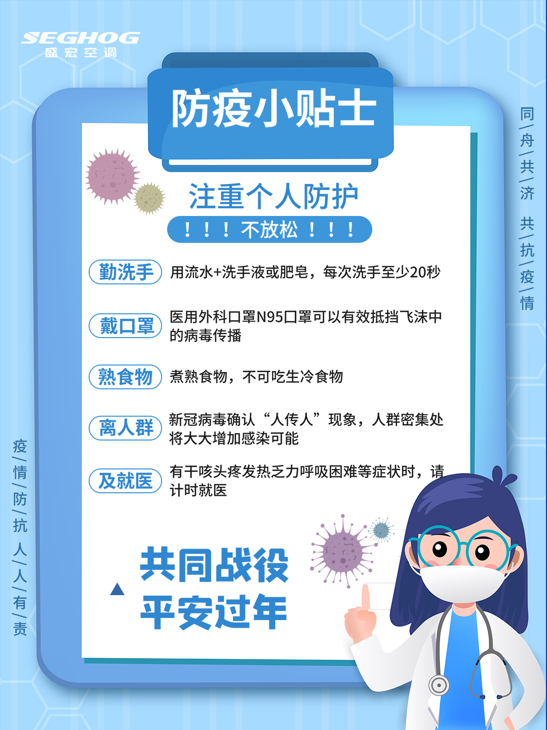新年之際,大家一定要做好預防措施,不聚會、不外出、出門戴口罩、勤洗手、勤通風等方法是非常有效的預防措施。堅定信心,齊心協力,團結應對。攜手贏得這場人類同重大傳染性疾病的斗爭。